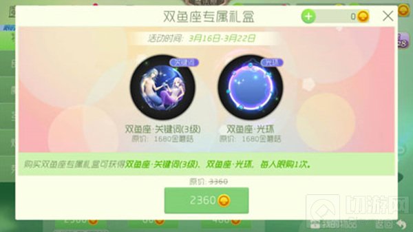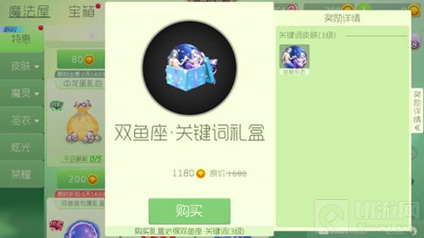 礼盒在魔法屋中使用金蘑菇可以直接购买,价值1180金蘑菇,开启礼盒必得双鱼座关键词(3级)。