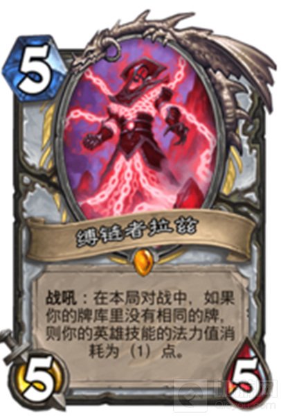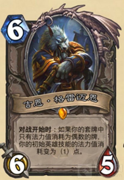 6费65,身材亏1费,能将你的英雄技能变成1费,但是效果是套牌中只有偶数消耗的卡才可以触发,和巴库一样出场就触发,不需要抽到。这个效果和修改后的拉兹是一样的。但是如今变成中立卡,让其他职业也有了选择的机会,说实话英雄技能减费和强化技能相比不相伯仲。平均价值是一样的,一个更灵活,一个对水晶利用更干净。同样是抽不到身材的亏损就可以假装看不到。问题也同样是出在触发条件上。