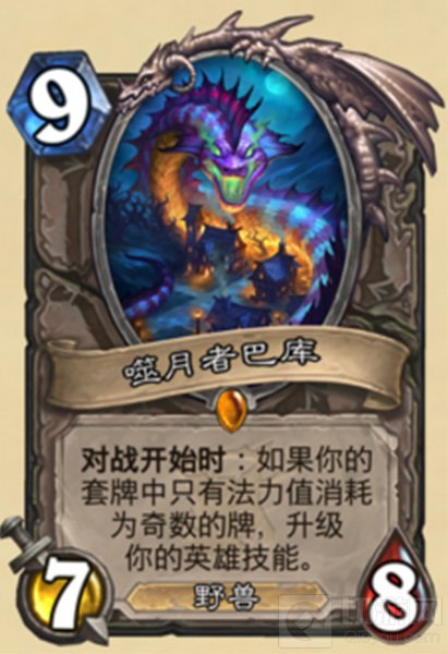 9费78野兽,身材亏2费,可以将英雄技能升级。但是效果是套牌中只有奇数消耗的卡才可以触发,这个触发效果的机制和卡拉赞的马尔扎克王子是一样的,开局直接触发,不需要抽到。也就是说你开局就会是一个强化的技能,存在一定的优势,至于这张卡的亏身材其实无关紧要,不抽到就不会被影响。那么关键难点在哪呢?在触发条件上,需要套牌只有奇数的卡,看清楚哟,是套牌,就是你真的不能带偶数消耗的卡。这个就有点太过分了。