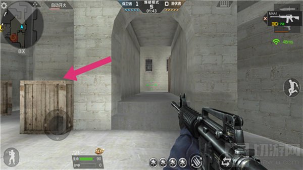 上图是小道的点位,这里的点位配合上图的点位能够两个人轻易的控制A爆破点,要注意如上图所示,敌人出现的位置是红圈内的范围。在敌人突然冲出后我方不可以乱了阵脚,推荐扫射十发左右的子弹后立刻躲在箭头所指的箱子后(及时不能击杀敌人),因为我方以高打底对手是不可能轻易冲过来的。大家的目的是阻止敌人安装炸弹,所以注意听敌人的脚步保持对峙就可以了。