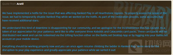 针对排名对战出现的问题,我们对《炉石传说》所有地区的服务器进行了快速修复。为控制这个问题的影响范围,我们在前段时间不得不暂时关闭了排名对战功能。