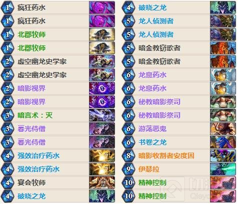 我们起手找北郡牧师、虚空幽龙史学家、暗影视界。对上快攻卡组时要留疯狂药水、破晓之龙,手牌好的话可以留一张龙息药水;对上控场卡组时要留暮光侍僧,手牌好的话可以留龙人侦察者。