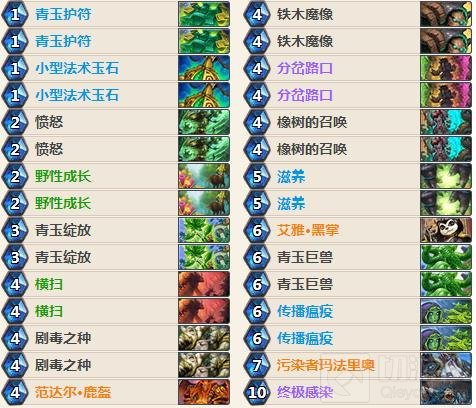 术士:唯一感觉的大劣对局,起手留跳费和剧毒之种,优先留剧毒之种。狂野巨人术巨人一波我们能剧毒解然后反铺一波大青玉就稳了,打术士我从五级打上来仔细想想德鲁伊赢得场数并不多,不超过5吧。没办法,德的解场自古以来就弱,对面总能干掉我的传播瘟疫上来揍我们的脸。魔块术同样,个人感觉37开甚至是28,遇到术士的话祈祷对面不够胡吧。不够胡我们还是可以与其一较高下的。
