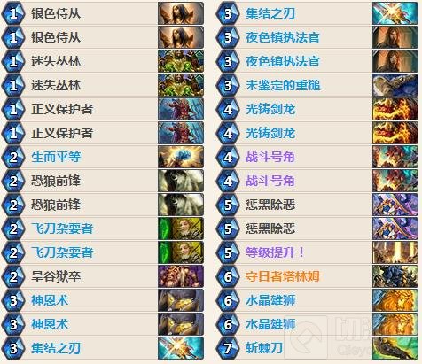 这套卡组胜率达到60.06%(目前胜率还有所上涨),是骑士目前版本非常有特色并且强度高的卡组。最关键的是消耗奥术之尘才4740,并且不会因为杀手蟹的原因被同类型卡组针对,非常值得推荐,那么下面我们先看看卡组: