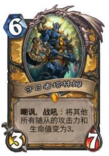 塔林姆在这套牌中作用非常大,比起鱼人骑和老版快攻骑要更加的明显。首先一地报告兵我们可以配合效果提高攻击解场或者斩杀。其次配合斩棘刀战吼、迷失丛林、旱谷狱卒等可以打出非常灵活的COMBO,这是之前骑士卡组都不具有的!