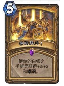 等级提升只带了一张,因为5费还是可能会卡手的,这张牌只要BUFF到3个以上就是赚的,3个就是总体BUFF了+6+6嘲讽,并且攻击频率高是优势,不是单纯的类似王者祝福单体收益。如果本身就有圣盾的报告兵加上这个BUFF是非常强势的,圣盾嘲讽的3/3报告兵!