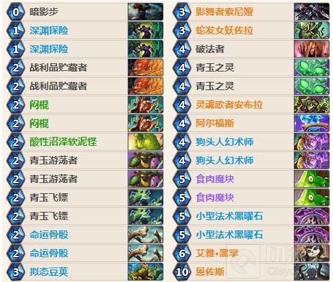 我们起手找青玉飞镖、深渊探险、战利品贮藏者、青玉游荡者、命运骨骰。对上快攻卡组时我们可以留一张闷棍,前期可以拖延对手的进攻节奏;对上控场卡组时可以留灵魂歌者安布拉,它能在中期给我们带来节奏优势。