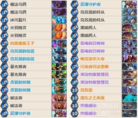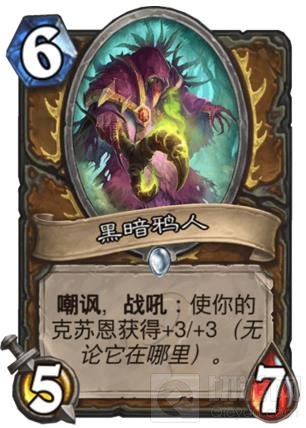 黑暗鸦人则是德鲁伊职业和克苏恩相配合的卡牌,6费5-7的身材非常优质特效更是可以给克苏恩+3/3。前中期通过以上的卡牌不断提升克苏恩的身材到中后期在克苏恩身材达到10-10的时候就可以使用维克洛尔大帝形成两堵非常强力的墙。克苏恩是卡组中的获胜手段之一我们带了八张克苏恩关联的卡牌,但是我们也把克苏恩buff到十几。就已经差不多了,克苏恩的战吼可以打出成吨的输出。