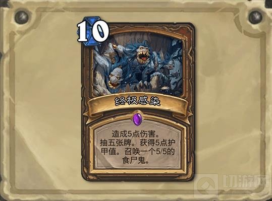 10费,效果:造成5点伤害,抽5张牌,获得5点护甲值,召唤一个5/5的食尸鬼。职业:德鲁伊。出处:冰封王座。品质:史诗,终极感染,又称终极赖皮,解场,回血,站场,斩杀,抽牌于一身,能够让一个没有卡牌没有随从的德鲁伊瞬间翻盘,极其强大的效果让玩家大呼赖皮。适合卡组:青玉德,任务德