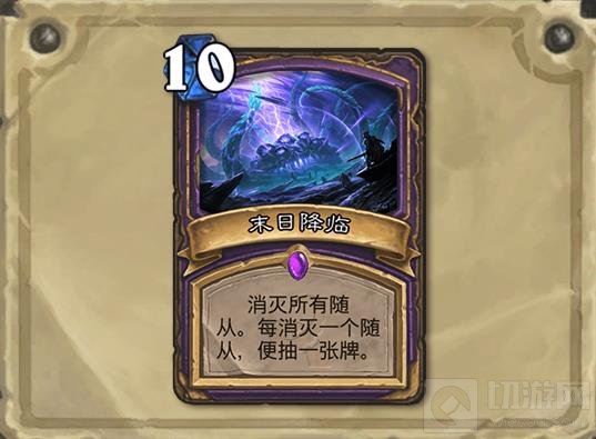 10费,效果:消灭所有随从,没消灭一个随从,便抽一张牌。职业:术士。出处:上古之神。品质:史诗。这卡要是给德鲁伊啊,圣骑士啊,说不准还有点用,但是给了我们自带抽牌效果的术士就有点不合适,后期使用后期爆自己牌,十分尴尬。