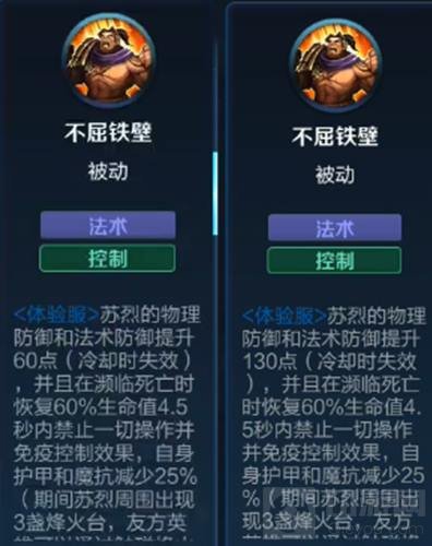 解析:苏烈的物理防御和法术防御增加的初始为60点,又因为每级会增加5点,所以满级的时候,双抗将增加到130点。而且苏烈濒临死亡时,将会立刻触发被动,回复60%的血量,但又因为在4.5秒内,苏烈将无法进行任何操作,所以近身复活便无法使用了,并且自身的双抗也会减少25%,与此同时被动叠加的双抗也将直接取消。而4.5秒持续时间结束,或队友提前触碰了三盏烽火台,苏烈将对周围造成大量伤害,并附带减速效果,与此同时也将在5秒内提升自身50%攻速和30%移速,此时如果携带了装备不死鸟之眼,将会受到不死鸟的被动恢复效果加成。