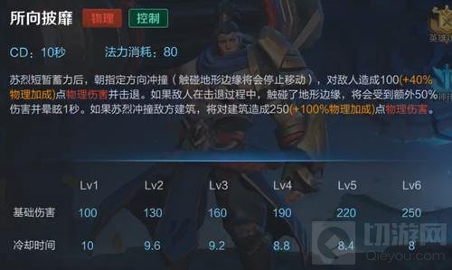 解析:①伤害量:首先先介绍基本属性,当苏烈撞上敌方的距离超过400码时,都将会造成3段伤害判定(一个闪现400码),也就是(100+30/LV+0.4AD)*3的伤害值。