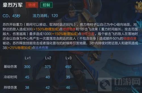 ②二技能对塔伤害:苏烈的二技能对塔只有一段伤害,伤害值为二技能伤害的2.5倍,并且伤害值将随二技能的提升而提升(在测试服里为1.5倍)。