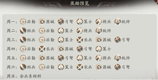 兵器材料每天都会轮换,如果当天没有刷到自己需要的种类,就不要浪费体力。第一周主要产出统帅和后勤材料,第二周主要产出后勤和骑兵材料,第三周包括后勤和器械材料,第四周主要是长兵和弓弩材料,第五周包括统帅和器械材料,周日可以刷到所有需要的材料。