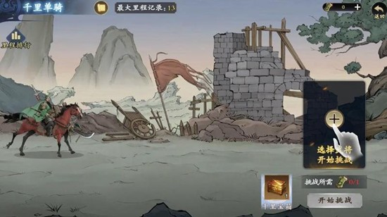 想要开启名将杀千里单骑战役,玩家需要先满足拥有16名以上武将的基本条件。这个门槛虽然不高,但要求玩家对各个武将的特性有足够了解。千里单骑是一种单人挑战玩法,玩家只能选择一个武将独自上阵,虽然羁绊效果仍然生效,但熔炼武将和使用变阵令的功能暂时无法使用,因此开局准备显得尤为重要。