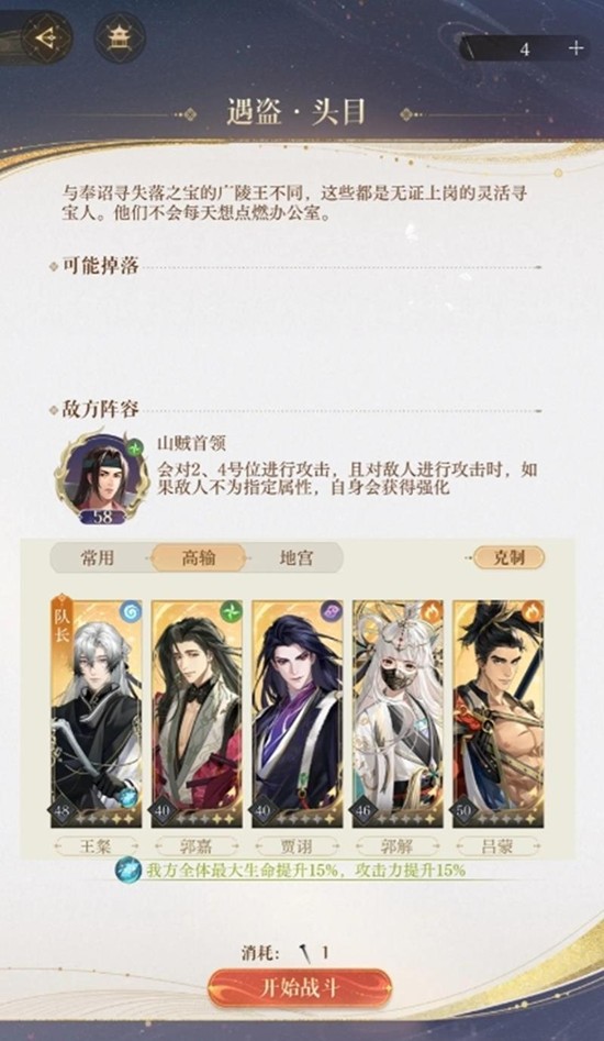 首先进入匣椟选择挑战后,玩家会被传送到Boss山贼首领的场景。这一关卡中有两个主要Boss,它们分别固定攻击2号位和4号位。红衣首领对敌方4号位造成300%攻击力的伤害,如果无法选中4号位则会选择顺序下一位目标。他的普通攻击对4号位造成100%攻击力伤害,同样在无法选中时会转移目标。红衣首领的天赋是在攻击非地属性敌人时获得3层狂热,受到非地属性攻击时获得1层狂热,受到地属性攻击时减少2层狂热。狂热状态能够提升10%攻击力,效果可叠加。