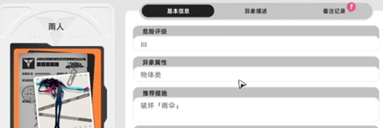 雨人是一种擅长伪装与偷袭的异环怪物,常态下外观与普通雨伞无异,常静止于街角或屋檐下。在晴朗天气中尤为隐蔽,极易被玩家忽视。一旦有目标靠近,雨人会迅速展开攻击,利用伞骨突刺与水刃进行近身打击。唯有将其本体——雨伞结构彻底破坏,才算完成挑战。因其突袭特性,雨人在异环怪物图鉴中被列为高危目标。