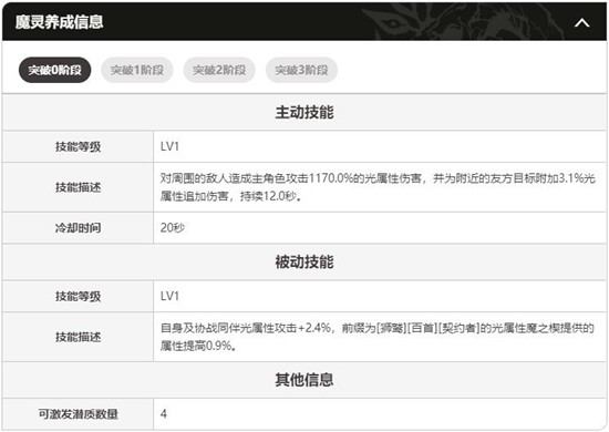 欧泊艾尔芙的被动技能名为光之共鸣,效果是提升自身及队伍中所有光属性角色的基础攻击力。这一增益为常驻型,只要她在场就能持续发挥作用,适合长期作战场景。更关键的是,当队伍中装备了带有特定前缀的光属性魔之楔时,该被动还能进一步强化这些魔之楔的属性加成效果。这种机制让她在搭配专属装备体系时,能为整个光属性阵容提供额外一层属性叠加,增强队伍的战斗稳定性与爆发潜力。