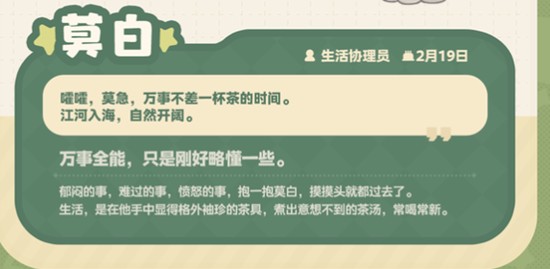 莫白是星布谷地中一位极具辨识度的友邻调查员,他的存在为整个星布谷地增添了一份宁静与从容。他总是在固定的时间出现在茶座旁,手中摆弄着一套精致小巧的袖珍茶具,动作不急不缓,仿佛时间在他身边也放慢了脚步。他出生于2月19日,正值冬春交替之际,这个时间节点也映射出他性格中的过渡感与包容性。他说得最多的一句话就是“不要着急,就算着急,也不差一杯茶的时间”,这句话已经成为他在星布谷地居民心中的标志性语录。