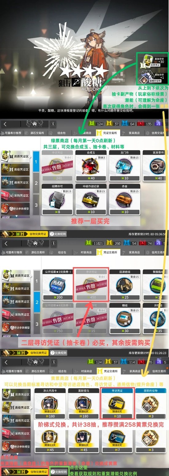 绿票和黄票获得主要途径共抽标准寻访卡池、抽限定寻访卡池、公开招募。