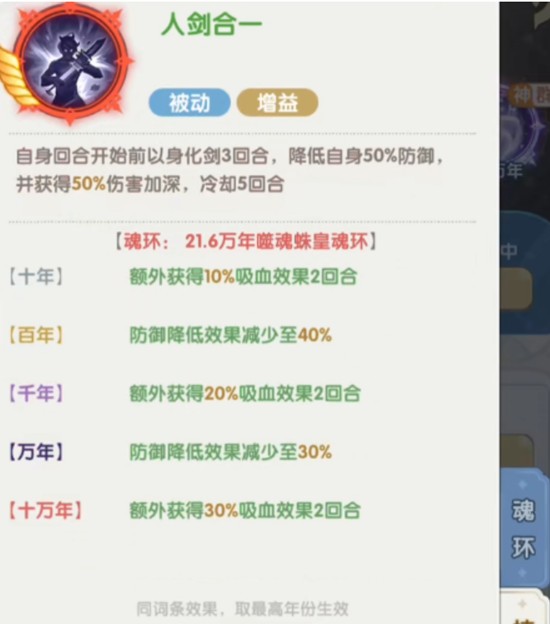 尘心的被动技能人剑合一为其核心机制之一,触发后尘心将进入神化剑状态持续三回合。在此期间,虽然自身防御力下降50%,但会获得50%的伤害加深效果,同时对敌人施加持续伤害。若搭配合适的魂环,该技能还能衍生出吸血、破甲与减防效果,进一步提升其在战斗中的输出能力与生存续航,使其在长时间对战中依然保持压制力。